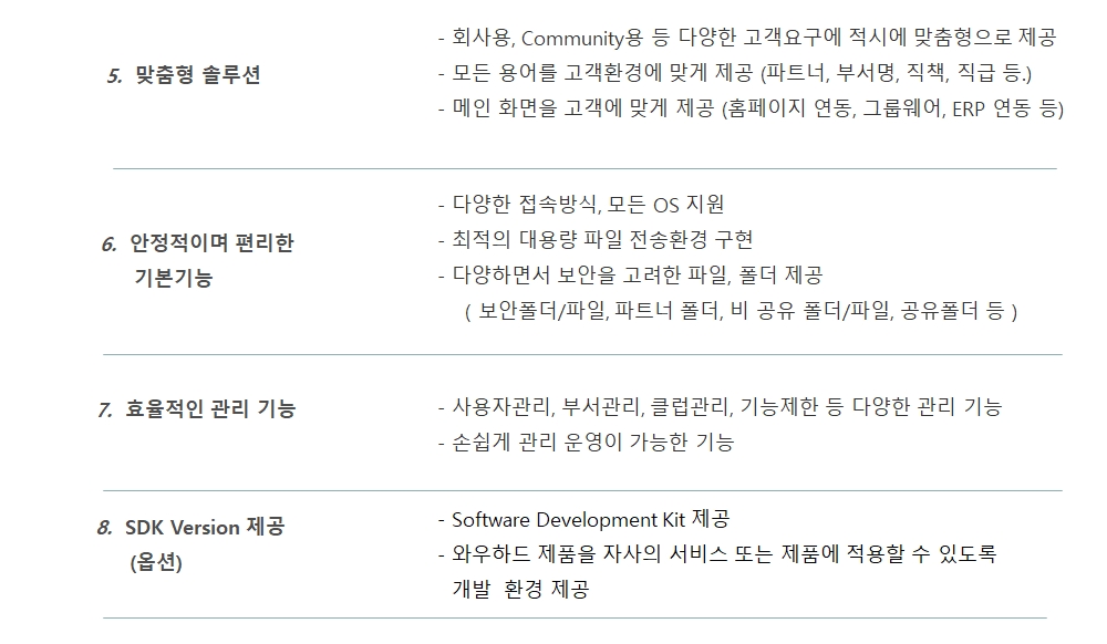 다양한 접속방식, 모든 OS 지원, 최적의 대용량 파일 전송환경 구현, 편리하며 쉬운 사용자 및 관리자 기능